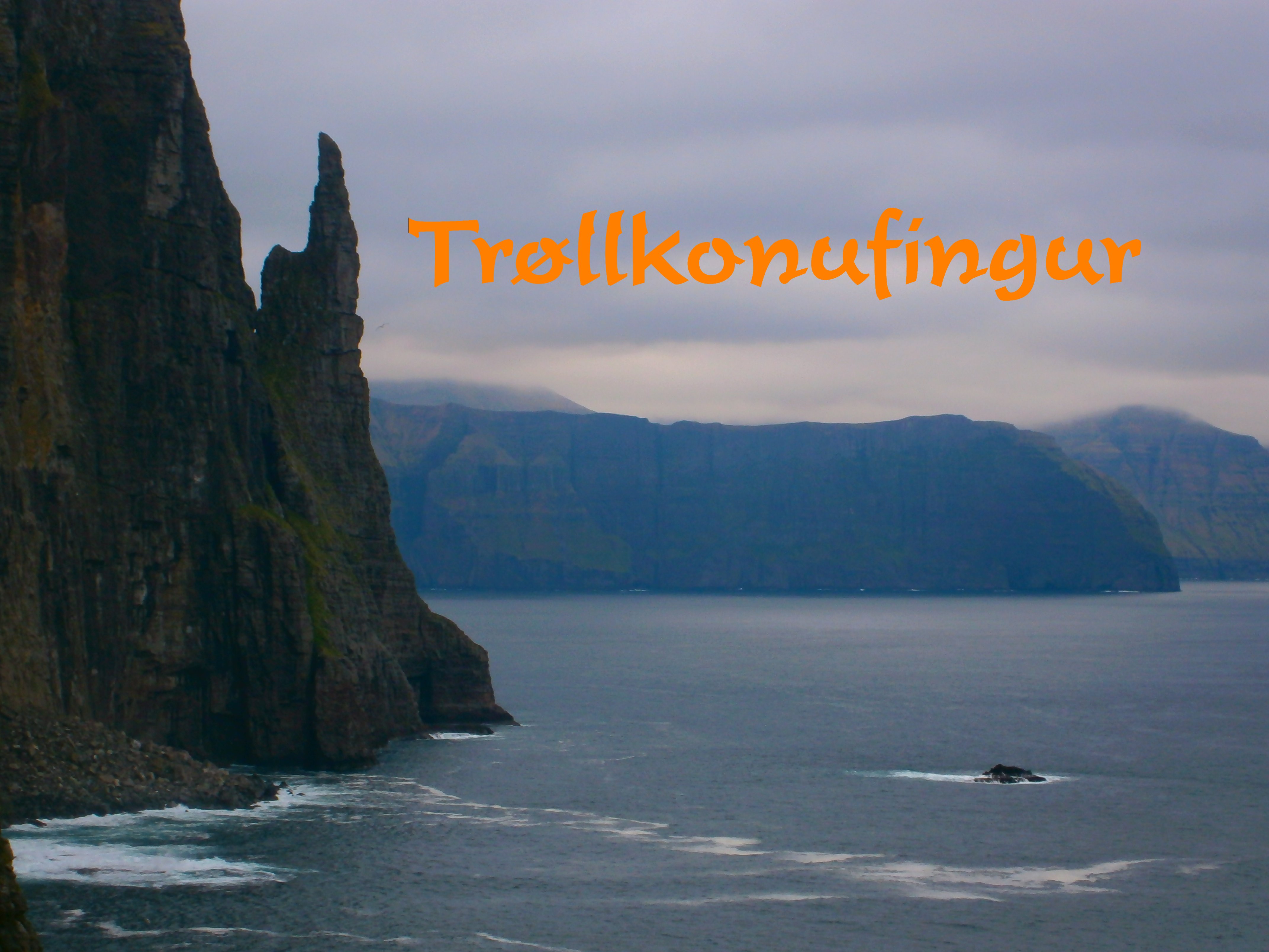 Trøllkonufingur, meaning "witch finger" is a craggy clifftop (313m) that stands guard over the entrance to the Fjord to East of Sandavágur.