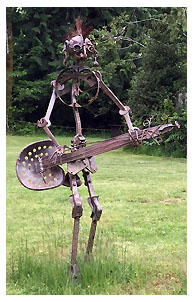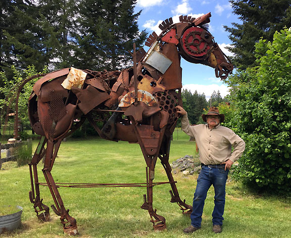 Dan hails from Minnesota, but moved to Seattle in 1957 (so he almost qualifies as a native). His interest in art began early, "sitting on the porch drawing as a young child," and he says art is the only reason he attended school. But he didn't develop his talent for metal sculpture until he became a mechanic and learned welding. He practiced by creating his first two metal masterpieces, and over the next 40 years, built a menagerie of eclectic, large-scale sculptures. Today, as a retiree, he continues creating new art from found metal and driftwood.
