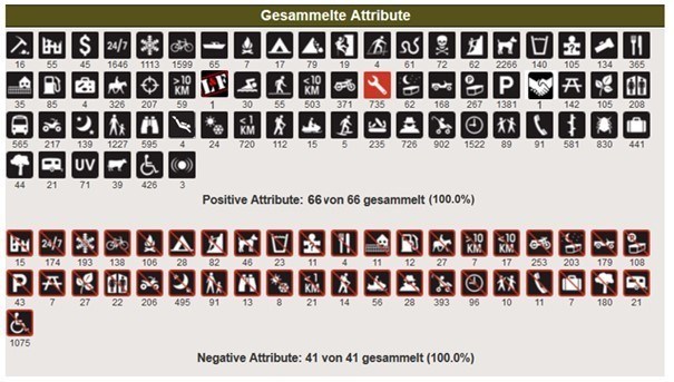 Neben vielem anderem kann man beim Geocachen auch Attribute sammeln. Es gibt zwei Statistiken, die mit den positiven und die mit den negativen Attributen.