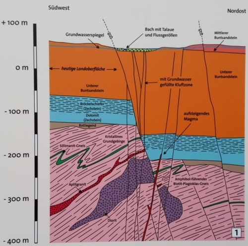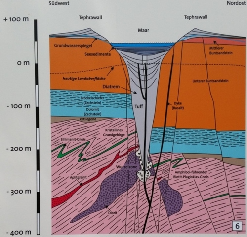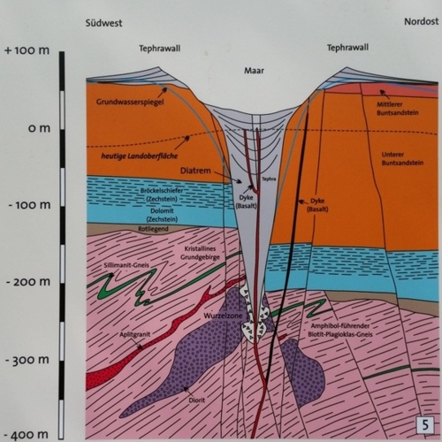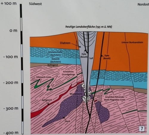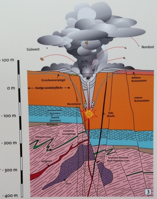 Abbildung 4: Aufgrund der anhaltenden Eruptionen reichte die Wurzelzone des Maar-Vulkans bis in das kristalline variszische Grundgebirge, und der Maar-Krater und das ihn unterlagernde Diatrem wurden immer größer. Nun fanden sich neben den Flussgeröllen, den Buntsandstein-Fragmenten und Tonsteinen ("Bröckelschiefer" der Zechstein-Formation) auch Gneis, Diorit und Aplitgranit im Tuffmaterial des Diatrems.