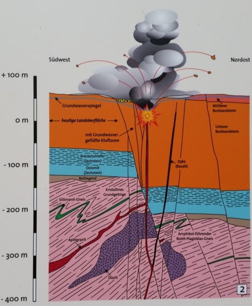 Abbildung 2: Während ein Basaltgang(Dyke) nach oben aufstieg, kein Grundwasser antraf und erstarrte, führte ein zweiter Nachschub unter dem Flusstal im Kontakt mit Grundwasser zu heftigen phreatomagmatischen Explosionen: Durch diese wurden Magma und Bundsandstein zerbrochen, durch den enstehenden Wasserdampf ausgeworfen und um den neu entstandenen Maar-Krater abgelagert.