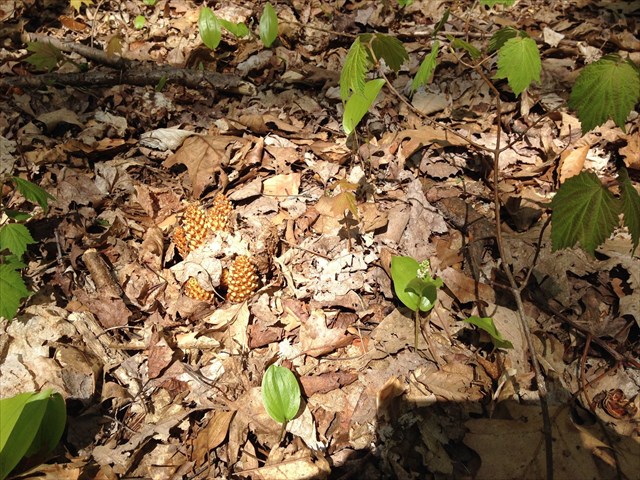 Squawroot is a parasite, taking nutrients from oak or beech roots. These are near the edge of the Ellis Hollow Preserve, just before the powerline. Turn right on the yellow trail at the kiosk. Then right on the red trail until it turns left, after quite a climb. There's a big dead log on the left, just before the unmarked trail you want comes in from the right. N 42 26.614 W 76 24.330.