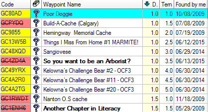 Or, you could log a list of 81 finds that includes (at a minimum) each cache’s difficulty and terrain ratings, GCCode, cache type, and the date you found it. For instance, here’s a partial list of our qualifying finds: