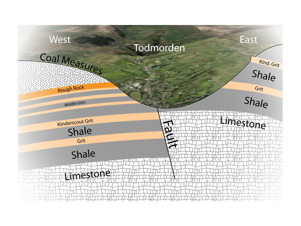 The land surrounding Todmorden is divided roughly East and West by a system of fault lines. Two Major Faults, the Deerplay and Cliviger Faults run roughly North West to South East with smaller faults running East to West, complicating the situation and giving the 'Todmorden Smash Belt' its name. The faults provide weak zones for weathering and erosion to shape the landscape. The Pennines rose towards the end of the Carboniferous Period as the result of the collision of two tectonic plates. Erosion and weathering has exposed coal measures, sandstones, mudstones to varying degrees, but with a marked difference East and West of Todmorden.