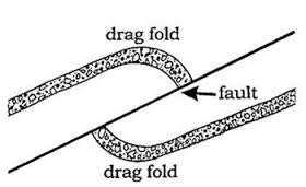 Drag folds are one of the simpler types of fold. They occur in conjunction with faults, and they represent the bending of rock before it breaks.It may seem, intuitively, that the rock in a drag fold is bent by being dragged along the fault surface—hence the name—but in fact drag folding must precede the actual breakage of the rock in a fault. Like everything else, rocks prefer to bend first before they break. In most cases, the direction of folding is toward the direction of movement on the fault.