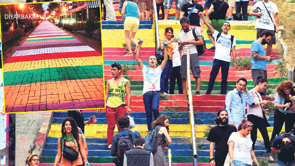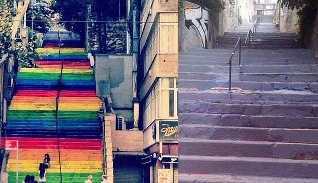 [ENG] 2013, August. A shop owner, 64, in Fındıklı and his friends paints the Fındıklı stairs to rainbow colors. The municipality presumably saw it as a rebellious act driven by a social and political agenda and 4 days later, dark at night, paints the stairs back to grey. In the morning, the news spreads so fast and people start to paint the stairs and the streets in their cities, with hashtags #direnmerdiven and #fırçanıkapgel (#resiststairs and #getyourbrush). Municipality, seeing this, repaints it to rainbow colors. Public outrage was swift and effective. In the wake of the Gezi Protests, the covering of the rainbow colours was seen as yet another sign of intolerance and lack of respect for citizens’ right to claim public spaces.