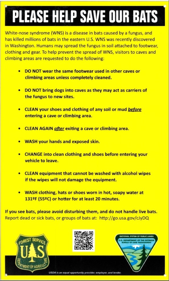 Boulder Cave is home to the only known population of Pacific Western Big-Eared Bats in this part of Washington State. The Pacific Western Big-Eared Bat is listed as a sensitive species in Washington and Oregon. A small population of 50 bats use Boulder Cave as a hibernaculum’s during the winter. In the 1920s and 1930s, the Boulder Cave bat population numbered in the thousands. These bats have historically used Boulder Cave during the summer, but presently do not. The big-eared bat is extremely intolerable to human disturbance. It appears the heavy human use during the summer has discouraged the big-eared bat's use.