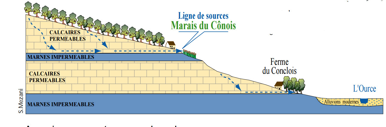 C’est au niveau de cette ligne de sources que s’installent les marais tufeux de pente.L 'eau jaillit à mi-pente et dépose le calcaire sur les mousses et végétaux formant ainsi une roche friable qu'on appelle le tuf.Ce dépôt calcaire construit des petits bassins suspendus.