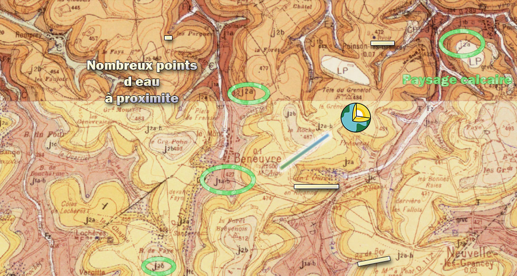 On the heights of the plateau of Langres , Beneuvre commune (15.4 km2) is located in the bank of the Paris basin on the Burgundy threshold, and more broadly on the Morvano - Vosges threshold. Here is the watershed line between the Seine and Saône -Rhône , with the highest point at 512 m.