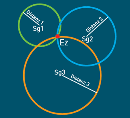 Für die Lokalisierung eines Epizentrums benutzen die Seismologen sogen. Seismografen. Ein jeder Seismograf (Sg) zeichnet ein Wellenmuster (Seismogramm) auf. Wir haben ja bereits gelernt, dass aus dem Zeitabstand zwischen der Welle P und der Welle S die Entfernung zum Epizentrum berechnen lässt. Zum besseren Verständnis sollen die Zeit-Differenzen zwischen den Wellen für unser fiktives Beispiel bereits bekannt sein, somit benötigen wir also nur noch die Distanzen. Für eine einzelne Station ergibt sich eine Kreislinie, auf der das Epizentrum liegen muss. Um nun noch den genauen Punkt zu ermitteln, braucht es die Informationen von mind. 3 Stationen. Im Schnittpunkt der dann entstandenen 3 Kreise liegt dann das Epizentrum (Ez).