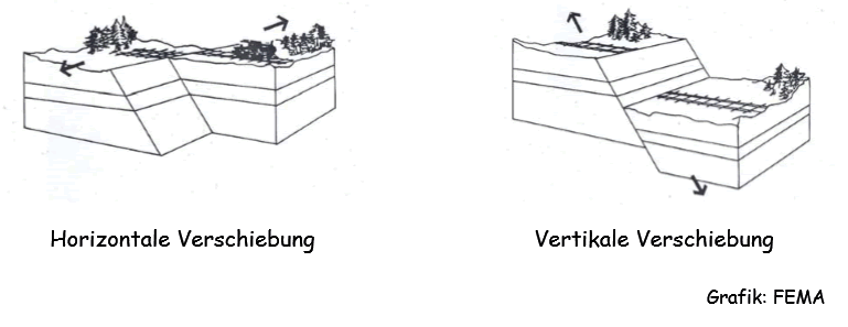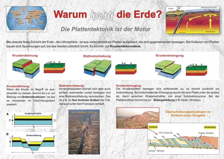 Wie du bereits erfahren hast, sind die Erdkrustenteile immer in Bewegung. Im Untergrund gibt es unzählige Bruchflächen, entlang derer sich die Gesteinsmassen bewegen. Durch Reibung bleibt das Gestein entlang der Bruchflächen stecken und baut Druck auf. Wird der Druck größer als die Reibung, bewegen sich die Gesteinsmassen ruckartig, was zu einem Erdbeben führt. Ein Erdbeben ist also eine Erschütterung der Erdoberfläche. Der Ort, wo das passiert, liegt tief unten in der Erdkruste. In der Fachsprache wird er als Hypozentrum bezeichnet. Direkt darüber an der Erdoberfläche liegt das Epizentrum. Dort treten die größten Auswirkungen auf. Starke Erdbeben sind oft mit der Bildung von Erdspalten, mit Schlamm-, Wasser- und Gasausbrüchen, Senkungen, Rutschungen und Bergstürzen verbunden.