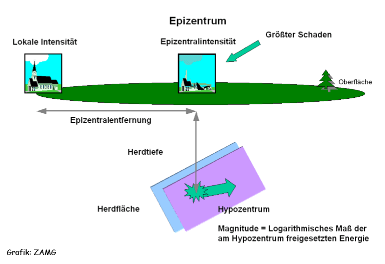 Wie bei einem Stein, der ins Wasser geworfen wird, breiten sich vom Ausgangspunkt eines Erdbebens nach allen Seiten seismische Wellen oder Erdbebenwellen aus. Sie versetzen die Gesteine des Untergrundes in Schwingung. Bei einem Erdbeben entstehen zwei unterschiedliche Wellenarten. Die zuerst an der Oberfläche ankommenden Wellen nennt man Primär- oder kurz P-Wellen. Durch sie wird das Gestein, wie bei Schallwellen, in Ausbreitungsrichtung zusammengestaucht und wieder gesdtreckt. Dann erreichen die etwa halb sso schnellen Sekundär- oder S-Wellen die Oberfläche. Diese Wellen lassen den Untergrund s-förmig zur Seite schwingen, etwa so, wie sich eine Schlange fortbewegt. Die Bestimmung des Epizentrums erfolgt, indem man zunächst die Differenz zwischen den unterschiedlich schnellen Erdbebenwellen ermittelt, die vom Erdbebenherd ihren Ausgang nehmen. Man überträgt nun die Differenz auf ein spezielles Diagramm mit einer Zeit- und Entfernungsskala und liest hierauf die dem Zeitunterschied entsprechende Entfernung ab. Anschließend werden die ermittelten Daten von mindestens drei Erdbeben-Beobachtungsstationen in einer Karte verzeichnet. Dabei schlägt man um jede der Stationen einen Kreis, dessen Radius die ermittelte Entfernung zum Epizentrum ist. Der Schnittpunkt der Kreise ergibt schließlich die Lage des Epizentrums.