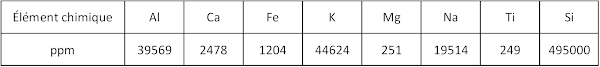 En tant que tel, ces résultats sont difficiles à exploiter. Pour en tirer des conclusions il est nécessaire de convertir ces mesures en taux des oxydes constitutifs des différents minéraux. Nous avons réalisé cette conversion, vous trouverez le résultat sur place aux coordonnées du poteau en bois.