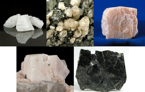 - calcic feldspar (anorthite CaSi2Al2O8), quite rare.