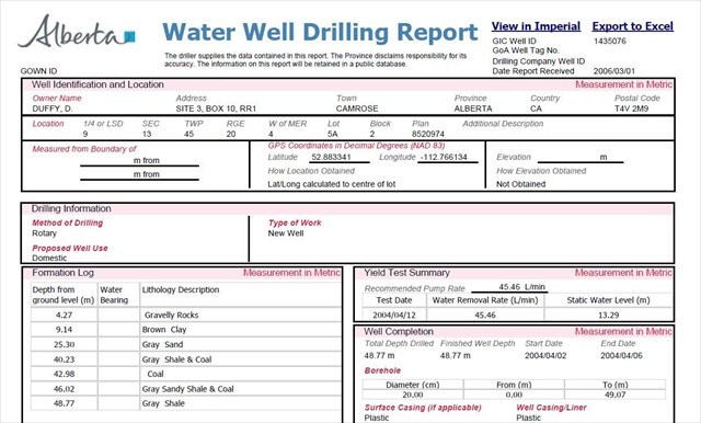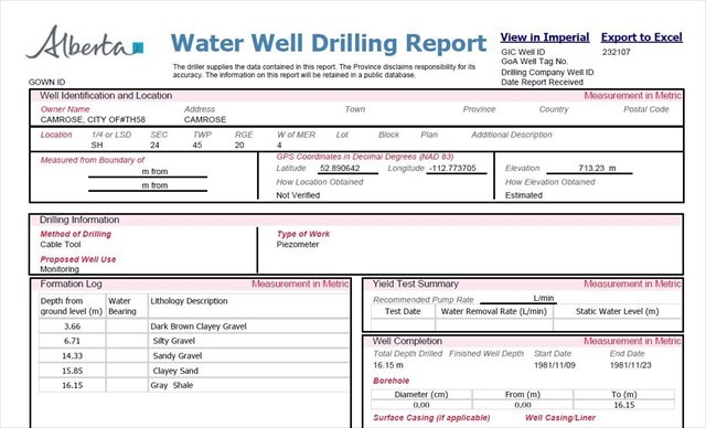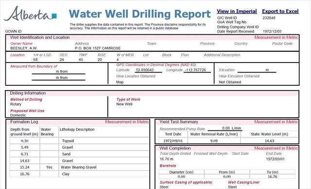 As noted in the "General Information" section above, an aquifer is a geologic layer of porous and pervious material. To get an idea of what the pervious material is for the Beesley's Spring aquifer, we have attached a couple of drilling reports from a few of the water wells in the area (Report #1, Report #2, Report #3). These drilling reports are public information, pulled directly off of the Province of Alberta's website: http://groundwater.alberta.ca/WaterWells/d/.