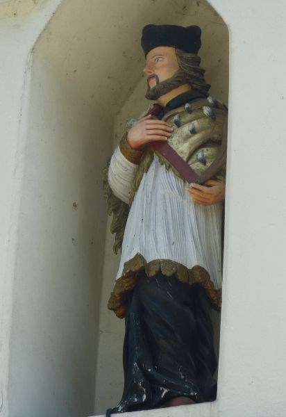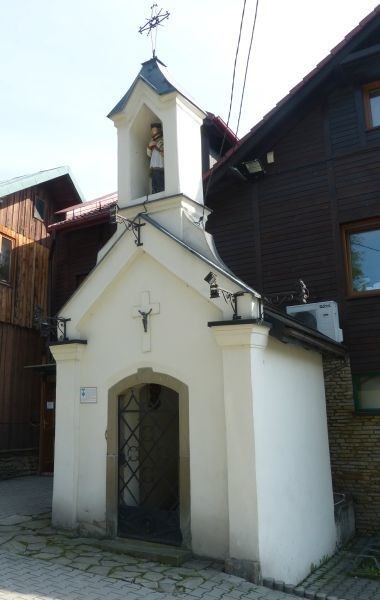 Kapliczka zbudowana pod koniec XIX w., murowana z kamienia i cegły, otynkowana rozplanowana na rzucie prostokąta, nakryta dachem dwuspadowym pokrytym gontem. Szczyt frontowy zwieńczony wieżyczka z okuciami z blachy na rzucie kwadratu z wnęką sklepioną trójkątnie, w której figura XIX w. z drewna lipowego św. Jana Nepomucena, czeskiego męczennika utopionego w Wełtawie z rozkazu króla czeskiego Wacława IV. Wg późniejszych źródeł przyczyną śmierci była odmowa zdradzenia tajemnicy spowiedzi królowej. Patron dobrej sławy, chroni od powodzi, opiekun mostów. Elewacja frontowa flankowana po bokach dwoma pilastrami zwieńczonymi kapitelami w postaci profilowanych gzymsów. Otwór drzwiowy sklepiony kamiennym łukiem koszowym,zamknięty ozdobną metalową kratą, nad nim krucyfiks z metalową postacią Chrystusa. We wnętrzu obraz olejny na płótnie z Chrystusem w ogrojcu. Remont kapliczki przeprowadzony w 2006 roku sfinansowany został przez: M. i E. Bogaczyków.