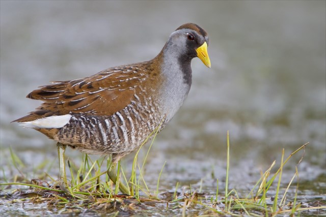 A small, secretive bird of freshwater marshes, the Sora (Porzana carolina) is the most common and widely distributed rail in North America. Its distinctive descending whinny call can be easily heard from the depths of the cattails, but actually seeing the little marsh-walker is much more difficult. They breed in shallow wetlands with lots of emergent vegetation, and build nests of floating vegetation. The young hatch covered with black down, and leave nest within one day, then are fed by the parents. The adults eat seeds and aquatic invertebrates.