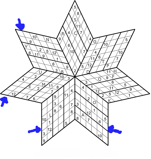 Règle similaire au sudoku 9x9. Chaque face de l'étoile à trois sections de 12. Chaque section doit inclure les chiffres de 1 à 12, and les "lignes" qui traverse d'une face à l'autre doit aussi avoir chiffre de 1 à 12. Très simple! (Les flèches en bleu sont 2 exemples de "lignes" qui traversent deux faces.)