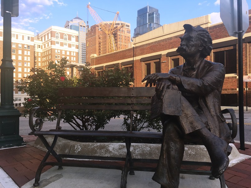This cache begins at a rare and fun location for a photo opportunity. Ever since I discovered this bench/statue of old Sam I’ve enjoyed visiting it and bringing visitors here when they are downtown. After a little research I learned this is one of many such benches including installments in San Diego, Berkley, St Louis, Salt Lake City, Austin, Seattle and of course his hometown of Hannibal MO.