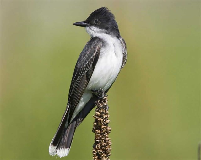 Eastern Kingbirds (Tyrannus tyrannus) breed in open habitats such as yards, fields, pastures, grasslands, or wetlands, and are especially abundant in open places along forest edges or water. They spend winters in forests of South America. They are blackish above and white below. The head is a darker black than the wings and back, and the black tail has a conspicuous white tip. Eastern Kingbirds often perch in the open atop trees or along utility lines or fences. They fly with very shallow, rowing wingbeats and a raised head, usually accompanied by metallic, sputtering calls. Eastern Kingbirds are visual hunters, sallying out from perches to snatch flying insects. The scientific name Tyrannus means “tyrant, despot, or king,” referring to the aggression kingbirds exhibit with each other and with other species. When defending their nests they will attack much larger predators like hawks, crows, herons, and squirrels. They have been known to knock unsuspecting Blue Jays out of trees.