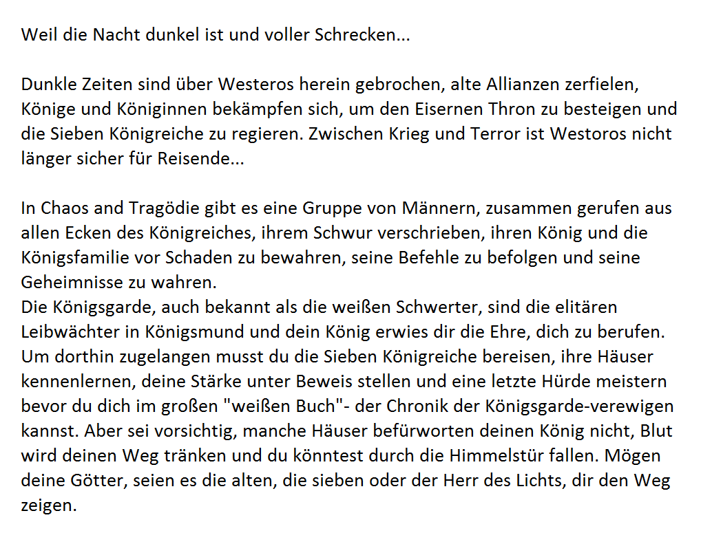 In chaos and tragedy there is one group of men, gathered from all corners of the kingdom, determined to their oath to keep their king and the royal family from harm, to obey his commands, and to keep his secrets. The kingsguard also known as the white swords are the elite bodyguard in King's Landing and your king honored you to be part of them.