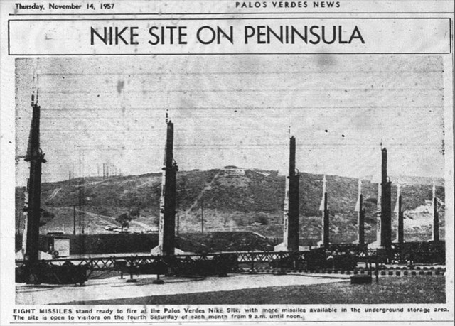 Below is a photo from the November 14, 1957 edition of the Palos Verdes News. Caption reads: Eight missiles stand ready to fire at the Palos Verdes Nike Site, with more missiles available in the underground storage area. The site is open to visitors on the fourth Saturday of each month from 9 a.m. until noon.