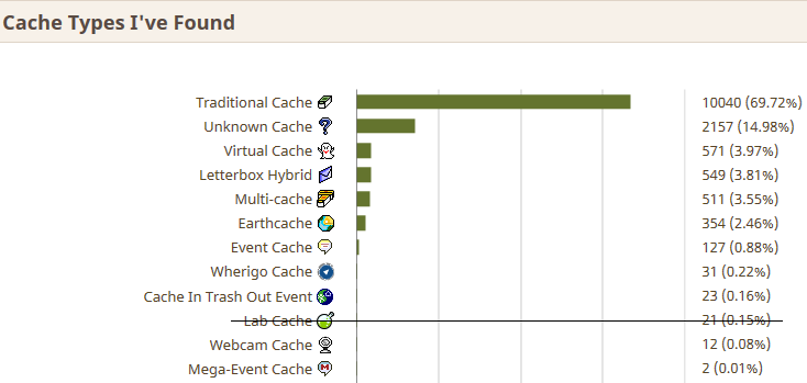 If your Groundspeak “Cache Types I’ve Found” bar chart can be viewed by the public, then you don’t have to prove you’ve met this challenge’s requirement; we’ll simply check your Groundspeak profile’s statistics page.