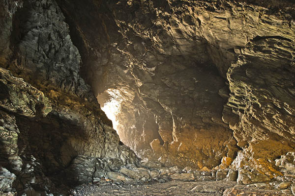 Below Tintagel Castle was a fault, it crosses all of Tintagel Head, the land on which the castle is built. It also crosses several other heads to the north and south, as can be seen from the castle. The rocks on the fault were eroded by the sea and so several irregular sea caves were formed, all in one row. Two caves are easy to access from the footpath to Tintagel Castle, by going down onto the beach. Both are high enough to walk through, both are going through the whole head to the other side.