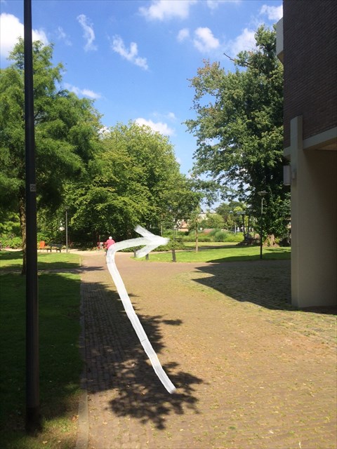 Vandaag gaat Kitty een stukje lopen, ze gaat een kaartje posten. Loop je mee? We beginnen bij het fietsenhok, dat staat naast gebouw parottia in het Emile van Loonpark.