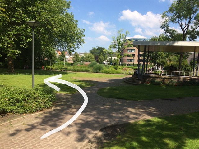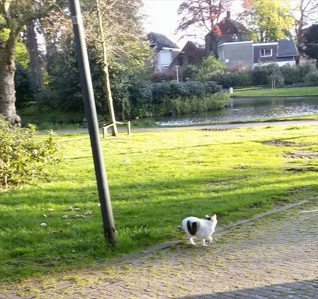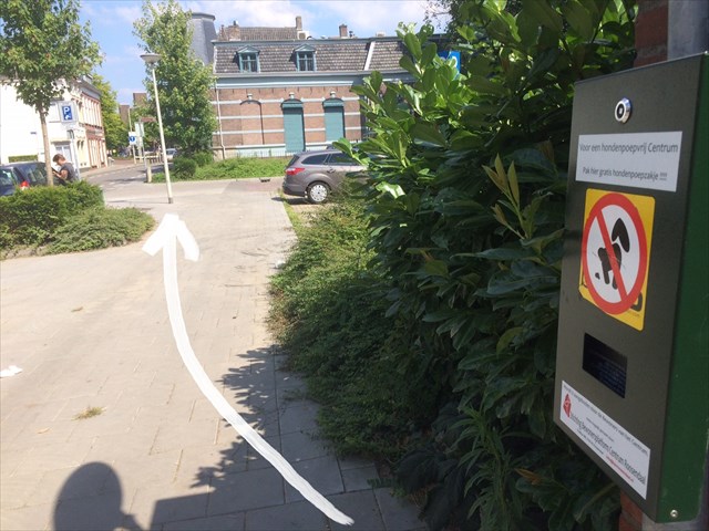 6. Het park uit en dan langs die gekke groene doos voor mensen met honden ga ik naar rechts: