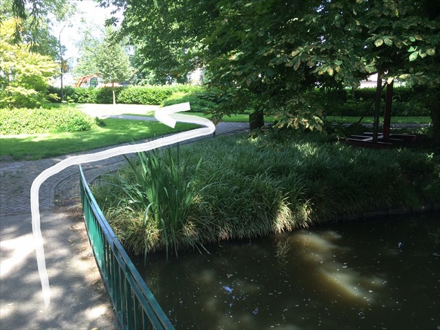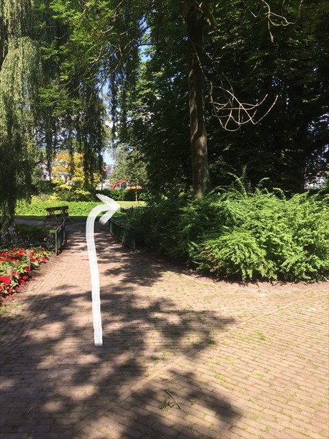 5. Na het bruggetje een beetje naar rechts langs de gestutte boom. En aan het eind ga ik naar links: