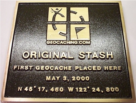 Am 3. Mai 2000 vergrub Dave Ulmer in der Nähe der Stadt Portland im US-Bundesstaat Oregon einen schwarzen Plastikeimer. Anschließend veröffentlichte er die Koordinaten des Verstecks in der Newsgroup. Innerhalb eines Tages nach der Veröffentlichung wurde der „Stash“ (englisch „Geheimversteck“, „geheimes Lager“) als erstes von Mike Teague gefunden. Drei Tage später erstellte dieser eine private Website, auf der er die wachsende Anzahl an Stashes und deren Koordinaten dokumentierte.