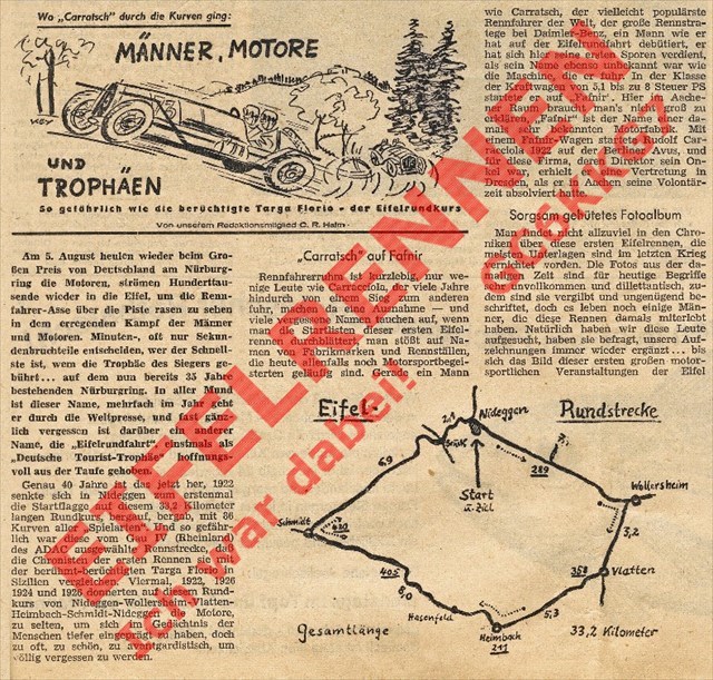 Folgt man den zeitgenössischen Berichterstattern, so hatte der Rundkurs um die Burg Nideggen durchaus das Zeug, sich als eine der großen deutschen Rennstrecken zu etablieren. Rückblickend darf allerdings bezweifelt werden, ob er noch lange mit den Entwicklungen im Motorsport hätte mithalten können. Die engen Ortsdurchfahrten und die teils hochgefährlichen Kurven sprechen dagegen. Letztlich zog das Eifelrennen 1927 zum Nürburgring um. Pläne, an alter Stelle ein anderes Rennen aus der Taufe zu heben wurden ebenso verworfen wie der Ausbau der Strecke bis kurz vor Gemünd. Ihren Reiz hatten die ersten Eifelrennen allemal und ich hoffe, dass ich Euch mit diesem Multi ein klein wenig davon vermitteln konnte.