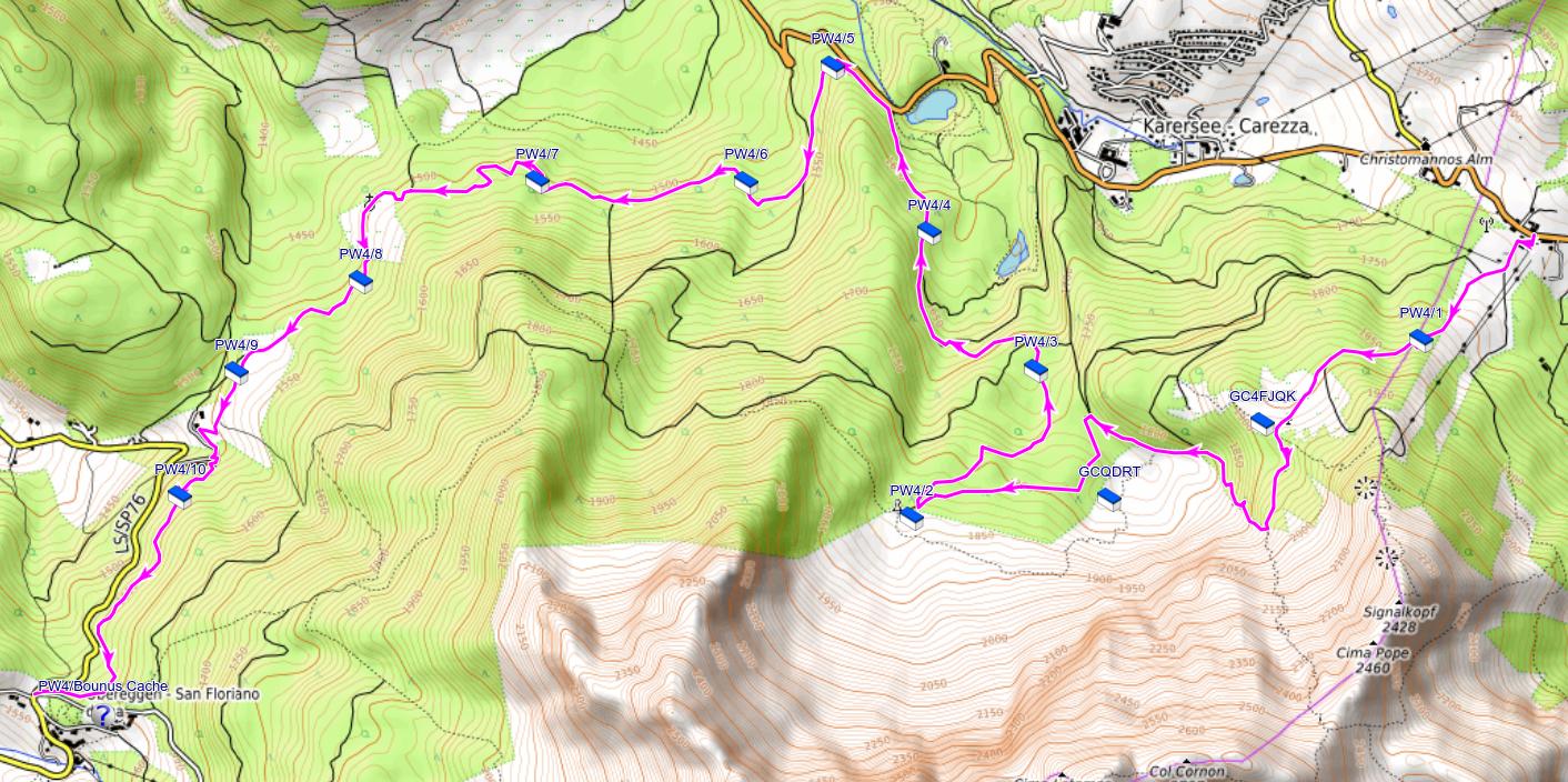ATTENZIONE: le informazioni per determinare le coordinate del Bonus Cache si trovano dentro alcuni dei logbook della serie “Perlenweg Eggental - 4. Etappe”