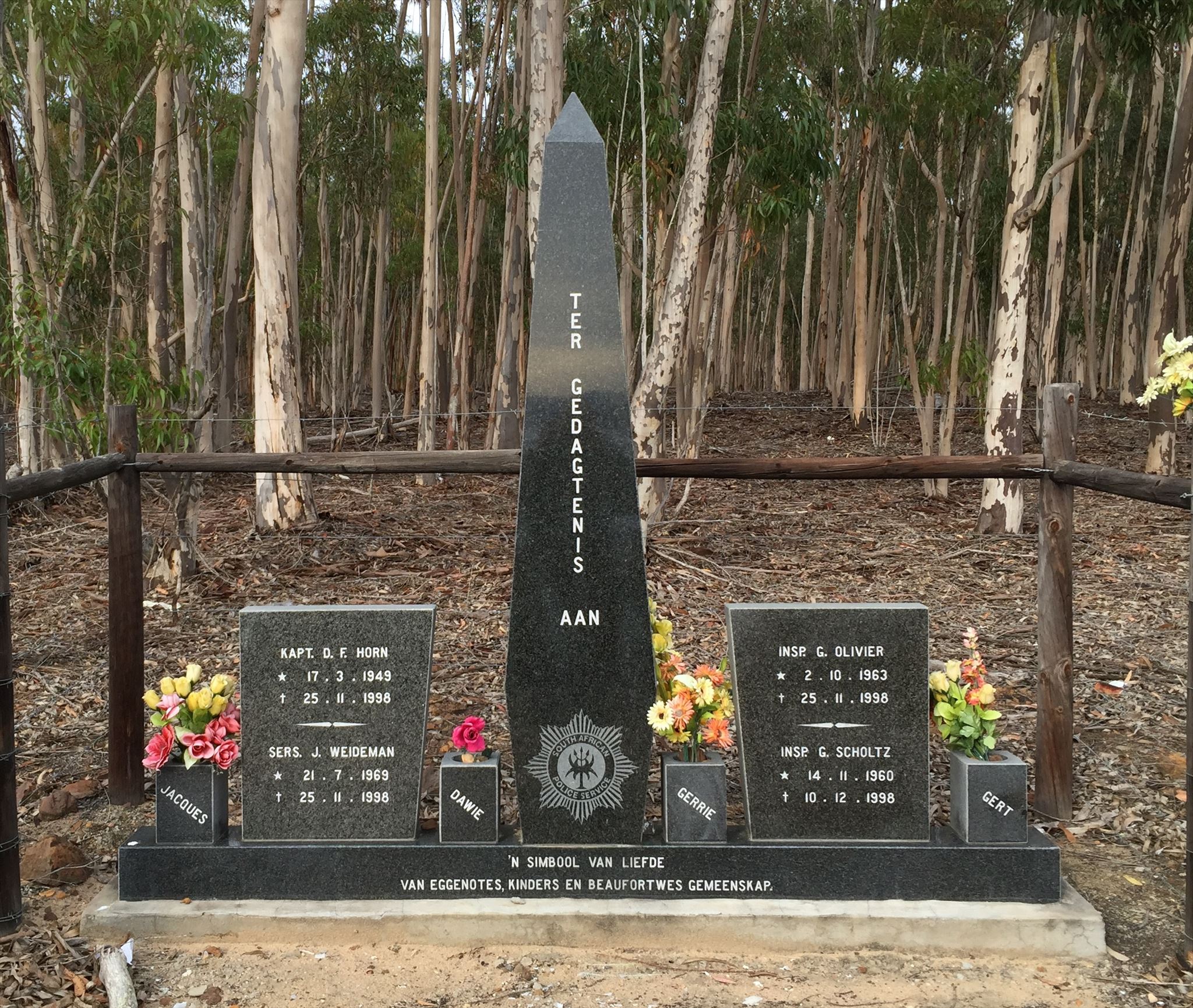 The memorial is on the scene of a serious car accident in which the Commanding Officer of the Beaufort West Stock Theft Unit died. Capt D Horn and Sgt J Weideman died on the scene. Insp G Olivier died at the hospital later in the day and Insp G Scholtz died two weeks later. Three other members of the unit were injured in the accident.