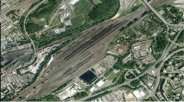 Na obrázku můžete vidět kolik kolejí je vedle sebe a jak je nádraží široké. Kdyby jste chtěli koleje spočítat, dojdete k výsledku, že jich je B a že nádraží má na šířku C m.