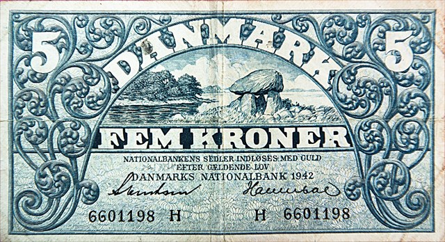 Archaeology: One of the first archaeologists who visited Karlssenen was Jacob Kornerup . He was also an illustrator and a painter. He came to see the Karlsstone in 1882. Two years before the stone was officially protected by registration. In Archaeological optics is Karlsstenen is not very special. In Denmark we have hundreds of dolmes like this with the same construction. Anyway, what makes this dolmen so special is that there was a picture of it drawn on a Danish banknote in the early 1900s. During the Golden Age many artists painted burial mounds and ancient monuments. Johan Thomas Lundbye is a famous Danish painter who paintet many romantic works in that period. But it was the painter Gerhard Hailmann (1859-1946) who was the originator of the work with the Karlssten on a five-krone banknote in the early 1900s. The banknote was in use until the end of second world war.