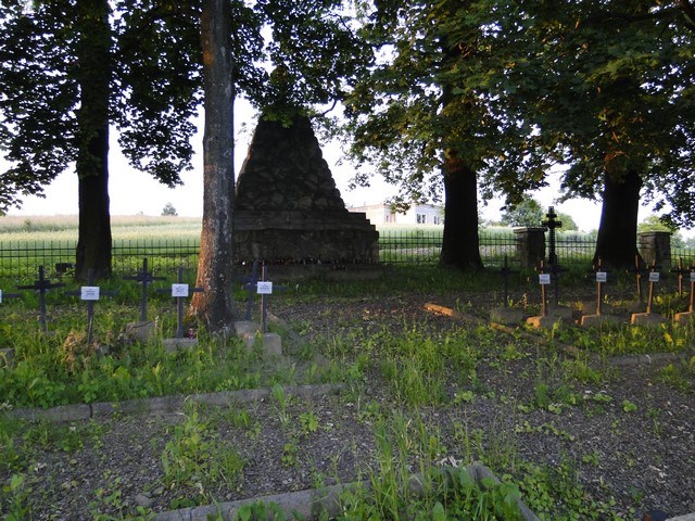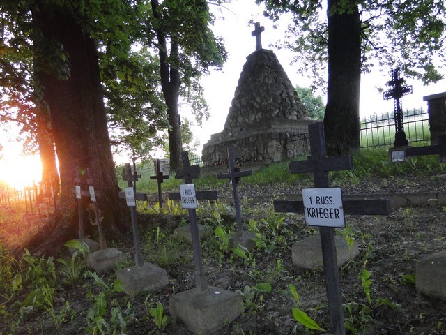 The war cemet ery No 26 in Sławęcin (the II Cemetery Region In Jasło) was designet by Johann Jäger. It was established In 1916-1917. There were buried the soldiers killed on 15 – 29 December 1914 during unsuccessful counteroffensive of Austro-Hungarian and German forces ageinst the Russian Army as well as during relieved Przemyśl fortress besieged by the Russians. In the battle for Jasło the 8th Russian Army defeated the 3rd Austro-Hungarian Army. There were buried the fallen on 5 May 1915 in the Battle of Gorlice. The III Caucasian Corps as well as the X Corps was defeated by the 12th Austo-Hungarian Infantry Division fron the VI Corps where 80% of Poles Served. There were also buried the soldiers who died of thier wounds In the field hospitals. Between the graves is located Aleksander Fuk’s grave. He died In 1918. The cemetery is surrounded with the stony wall. The central element of it is the obelisk in a shape of pyramid with a cross. In 40 individual and 5 common graves were buried the soldiers from armies: Austro-Hungarian – 62 from the infantry regiments (IR 20, 56) the 27th Landwehr Infantry Regiment (LIR 27), the 4th Tyrolean Infantry Regiment (TKJR 4), the 15th Field Howitzer Regiment (FHR 15); the 7th Landewhr Battalion. German - 1 from the 2nd Royal Prussian Grenadier Regiment (KPGR 2); Russian – 284 soldiers.