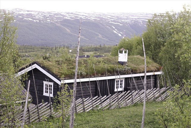 Some steps forward on the other side of the road is another moved log building, a store house became a cabin for Margot and Edvard.