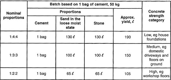 For the DIY person - there always comes a time when you need to make up a batch of concrete.  The following table will help in deciding what proportions you need to mix up to do the job properly.