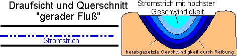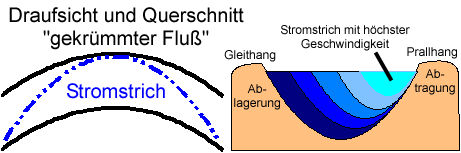 Bei gekrümmten Flüssen liegt die größte Geschwindigkeit des Wassers, aber auch die kleinste Geschwindigkeit an den Seiten. So kommt es zur Abtragung (Seitenerosion) auf der einen und zur Ablagerung auf der anderen Seite. Durch die beschriebene Ablagerung und gleichzeitige Abtragung kommt es bei Flüssen zu dem üblichen, geschlängelten Verlauf.