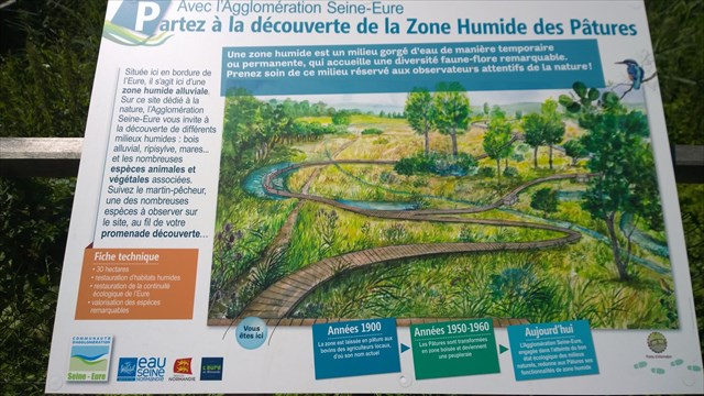 Vous vous trouvez au second point de départ possible situé côté village du Vaudreuil. La photo du panneau d'information est différente de celle située au point de départ opposé car elle vous montre la seconde partie du parcours situé sur la gauche avec ses 3 mares, dont le sentier vous ramènera vers le parking.
