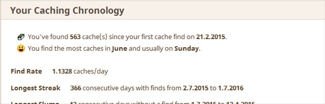 Zum Loggen ist es zwingend erforderlich einen Screenshot von eurem "Longest Streak" von Geocaching.com oder Projekt-GC.com als Bild anzuhängen. Ein einfacher Verweis auf das Profil reicht nicht! Logs ohne Nachweisbild werden umgehend gelöscht. (Ihr kennt den Sermon ja sicherlich, wenn ihr überhaupt mit dem Gerdanken spielt einen solchen Cache zu machen.)