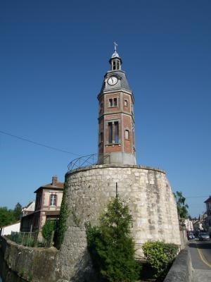 Le beffroi est situé en entrée de ville à l'emplacement d'une tour de l'enceinte médiévale construite par Hugues de Monthléry.La construction de cet édifice(consécutive à la démolition de l'ancienne mairie) avait pour but de ré-équiper la ville avec une horloge.