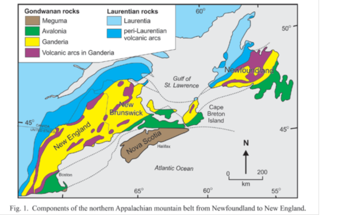 Cape Breton Island is part of the Appalachian mountain belt (Fig. 1). The Appalachian mountains formed by the closing of ancient oceans over a long time span of millions of years (between about 560 to 360 million years ago). Think of the building of the Appalachian mountains as analogous to a multiple vehicle accident in the fog - two big trucks (the Laurentian and Gondwanan continents) on each end and an uncertain number of cars caught in between – probably you can imagine the resulting mess? If you came on the scene, you might have a difficult time figuring out which pieces belonged to which car or truck, and in what order the collisions happened. Some collisions were head-on, some were side-swipes, and some were just glancing blows, leaving maybe just a bumper or wing mirror at the crash site.