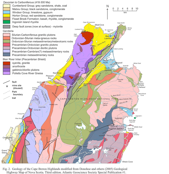 We call the piece of Laurentia preserved in Cape Breton Island the Blair River Inlier (Fig. 2). It is a fragment of Canada’s Precambrian Shield, and contains the oldest rocks exposed in Nova Scotia (age 1500 to 980 million years). These rocks are distinctive in their appearance and origin, and in the park they are exposed only sporadically on North Mountain. The other rocks in the Cape Breton Highlands are part of Ganderia, an area that had already had a complicated geological history before it became involved in the Appalachian collisions. It includes 620 and 550 million year old metamorphic and plutonic rocks in the western part (e.g., Cheticamp area) and in the southeastern highlands (which we call Bras d’Or terrane). Younger (originally overlying?) metamorphic rocks and associated plutons dominate the rest of the area (and underlie most of the Cape Breton Highlands National Park). The younger metamorphic rocks include metavolcanic, metaplutonic, and metasedimentary rocks of Ordovician and Silurian age (about 450-430 million years). Many of these rocks were involved in high-pressure and high-temperature metamorphism in the late Silurian - early Devonian (ca. 400 - 420 million years ago) as parts of Ganderia collided with one another and with Laurentia. Avalonia collided between about 420 and 400 million years ago, followed by Meguma (less than 400 million years ago). Each collision event was marked by the emplacement of granitic plutons, which have ages of about 440 Ma, 430 Ma, 400 Ma, and 375-365 Ma.