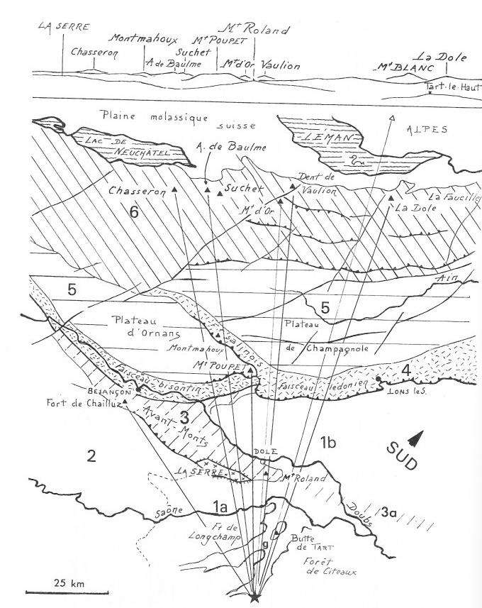 Le bord jurassien, dédoublé, avec le horst de la Serre et les Avants Monts, puis au delà les faisceaux chevauchants du Jura Externe