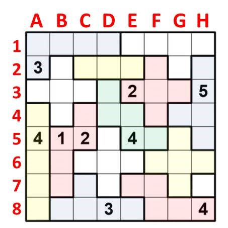 Beim Suguru ist ein Spielfeld in Gebiete eingeteilt, die jeweils mit Zahlen zu füllen sind. Aber natürlich nicht irgendwie, sondern nach folgenden Bedingungen: Besteht ein Gebiet aus N quadratischen Feldern, sind diese Felder mit den Zahlen 1 – N zu füllen. Aber: In orthogonal und diagonal benachbarten Feldern darf nicht die gleiche Zahl stehen! (Gemeint ist natürlich gebietsübergreifend, denn innerhalb eines Gebietes sind ja sowieso alle Zahlen unterschiedlich.)