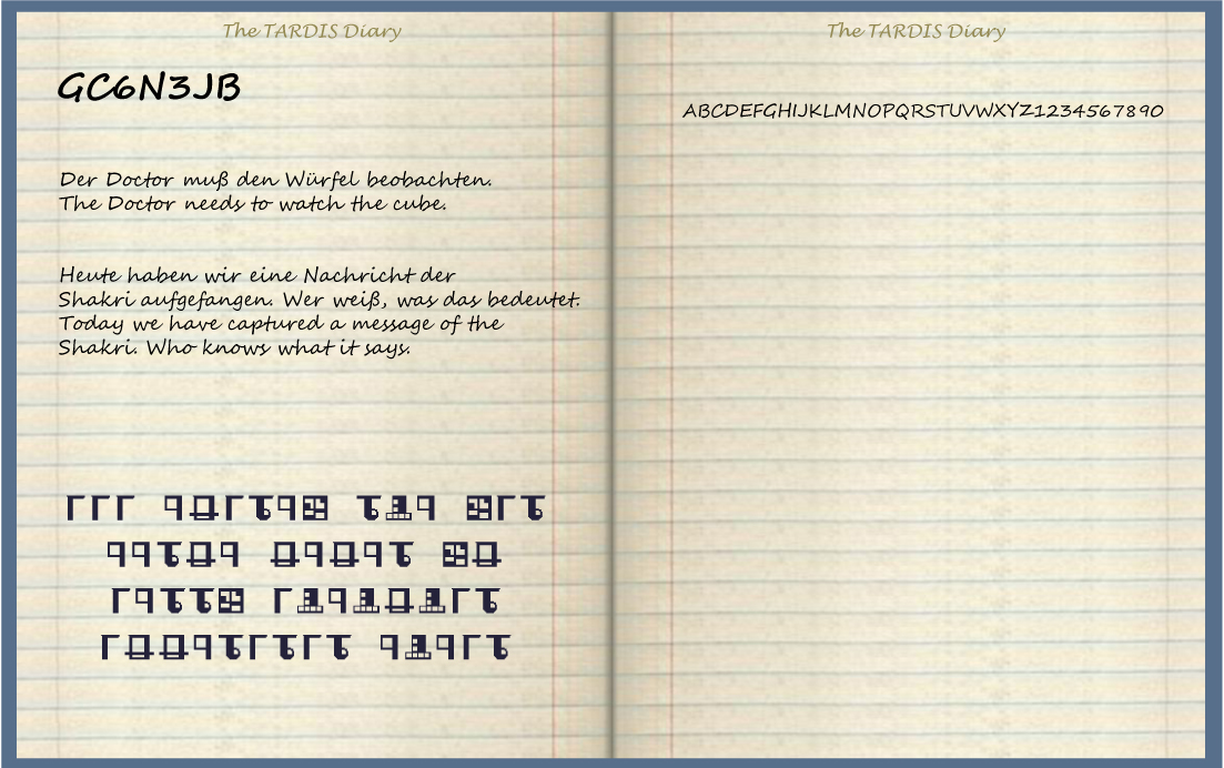 Auch Professor River Song ist eine Zeitreisende. Die Informationen aus ihrem Logbuch führen Euch zu einem Hinweis (Zwischenstation) mit Hilfe dessen Ihr den Standort des Würfels auffinden könnt. Dazu müßt Ihr die Zahlen, die Ihr an der Zwischenstation findet, in die folgende Formel einsetzen: