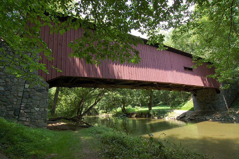 The bridge has a single span, wooden, double burr arch trusses design with the addition of steel hanger rods. The deck is made from oak planks. It is painted red, the traditional color of Lancaster County covered bridges, on both the inside and outside. Both approaches to the bridge are painted in red with white trim. It is 94 feet in legnth and 11 feet 8 inches wide (inside), with a total width of 15 feet, and an overhead clearence of 11 feet 6 inches. The bridge is a typical example of a Lancaster truss bridges, like the other covered spans. Its length is 90 feet and it is entirely made of wood, oak for the floor planks.